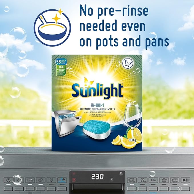 - With Sunlight tablets you don’t need to pre-rinse before putting dishes in the dish washing machine.