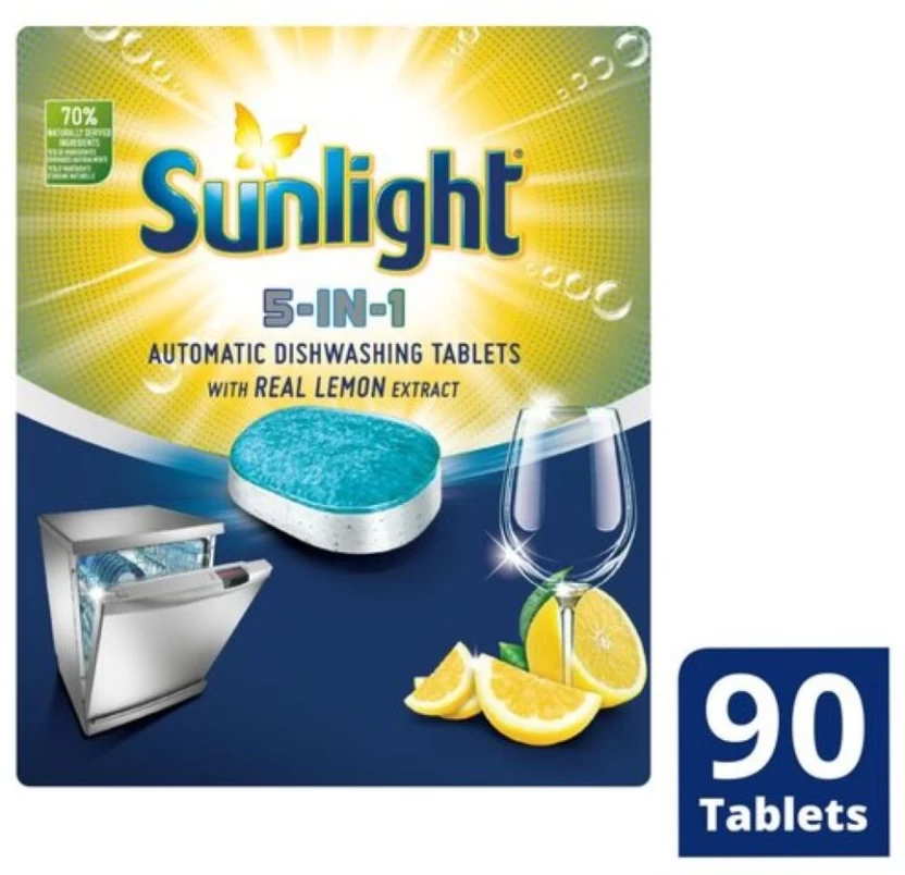 • Sunlight dishwasher tablets come in a 100% water-soluble and biodegradable sachet.