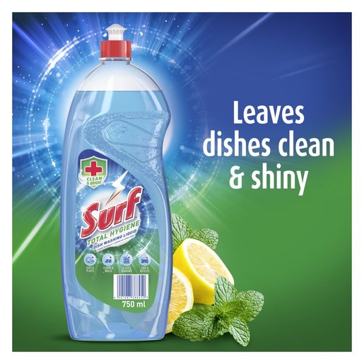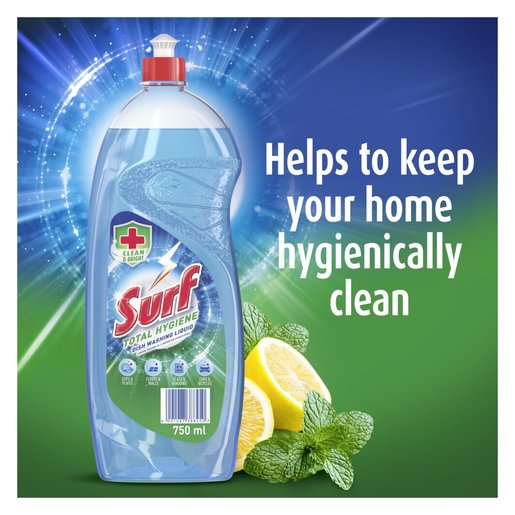 Surf Total Hygiene Regular Degreasing Dishwashing Liquid will help you to keep your home looking and smelling bright, fresh and clean. Surf Total Hygiene Degreasing Dishwashing Liquid is a freshly scented dish liquid that cuts through grease and leaves your dishes brightly clean. This freshly scented degreasing dishwashing liquid has been specifically formulated with lemon and mint to cut through unwanted grease and help to bring out the brightness in glassware and dishes. This multipurpose cleaner can also be used on surfaces like floors and walls, as well as to clean items like bicycles and cars. It can be used diluted or applied directly to dirty surfaces for a bright, fresh clean. It also cuts through grease and grime on glass to leave windows shining clean